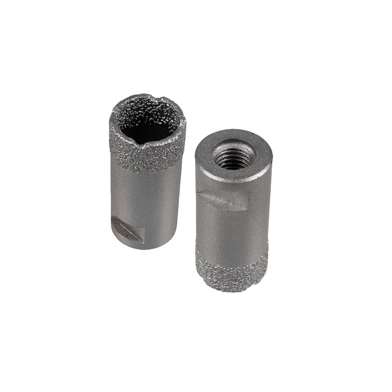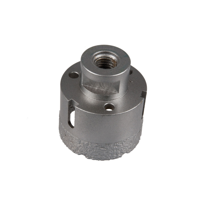 Vid borrning med Vinkelslip: Borren monteras i vinkelslip. Starta vinkelslipen och sätt an borren snett mot plattan. När borren fått fäste förs maskinen i cirklande rörelser. Rörelsen är mycket viktig för att borrkaxet ska försvinna vilket sänker arbetstemperaturen. Ett hål tar ca 15-30 sekunder i 9mm granitkeramik. Borren kyls i vatten efter varje hål